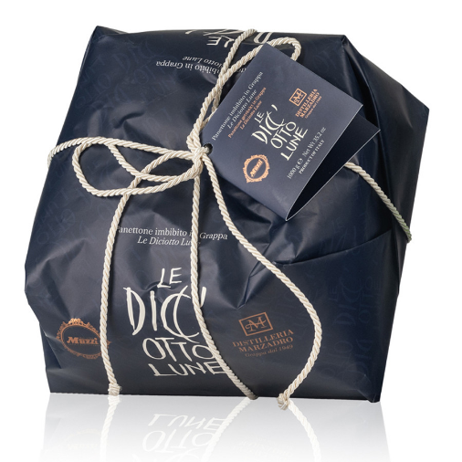 After a long leavening and slow cooking, the typical Christmas cake is soaked in Grappa to form Le Diciotto Lune panettone, creating a combination of strong character.